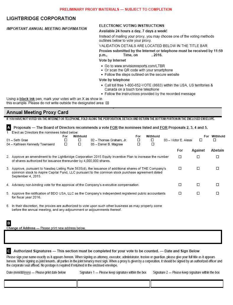 | PROPOSAL 2 APPROVAL OF AMENDMENT TO THE LIGHTBRIDGE CORPORATION 2015 EQUITY INCENTIVE PLAN TO INCREASE THE NUMBER OF SHARES AVAILABLE UNDER THE PLAN | |
