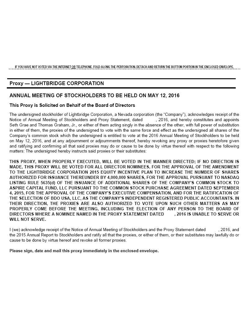 Notice is hereby given that the Annual Meeting of Stockholders (the annual meeting) of Lightbridge Corporation, a Nevada corporation (the Company), will be held on Thursday, May 12, 2016 at 10:00 a.m., local time, at the offices of Hogan Lovells US LLP located at 555 Thirteenth Street, NW, Washington, DC 20004, for the following purposes: