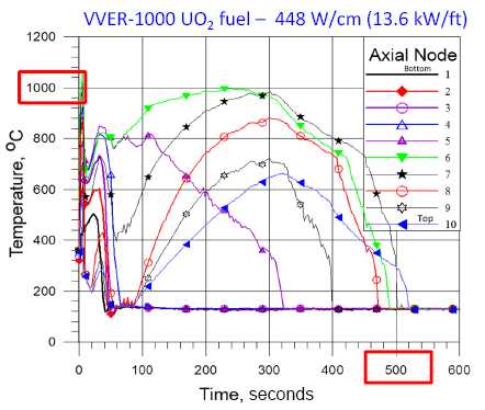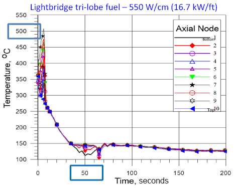 The graphs show the peak cladding temperature (PCT) at several points along the length of the fuel during the accident for both conventional uranium dioxide fuel and Lightbridge -designed metallic fuel operating at ~30% higher power density.