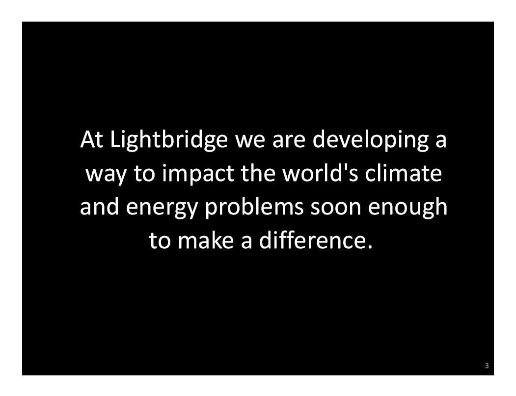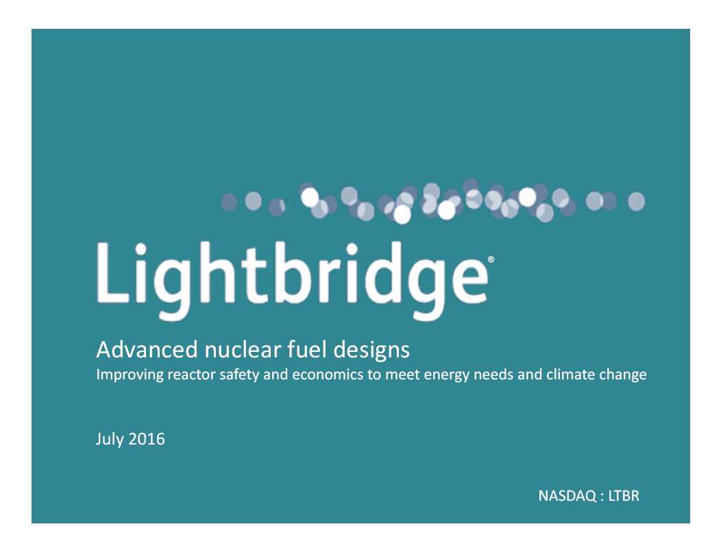 These statements are based on current expectations on the date of this presentation and involve a number of risks and uncertainties that may cause actual results to differ significantly from such estimates. The risks include, but are not limited to, the degree of market adoption of the Companys product and service offerings; market competition; dependence on strategic partners; demand for fuel for nuclear reactors; and the Companys ability to manage its business effectively in a rapidly evolving market, as well as other factors described in Lightbridges filings with the Securities and Exchange Commission.