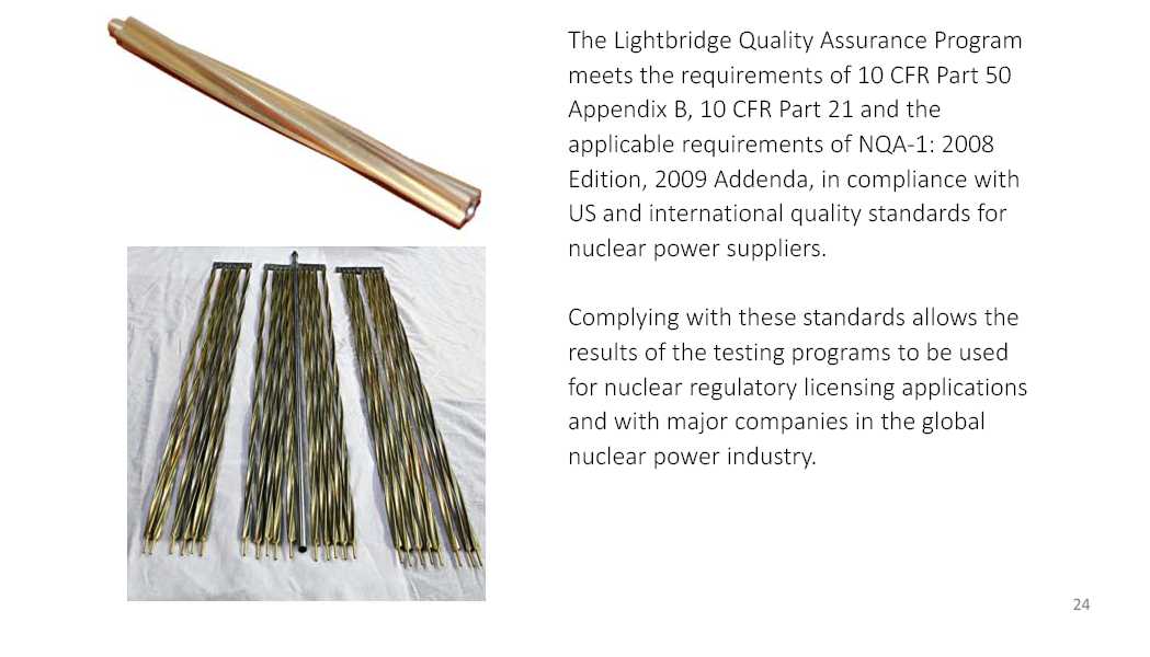 Lightbridge completed initial manufacturing and testing of its fuel in Russia, leading to planned testing under commercial reactor conditions in Norway in 2017