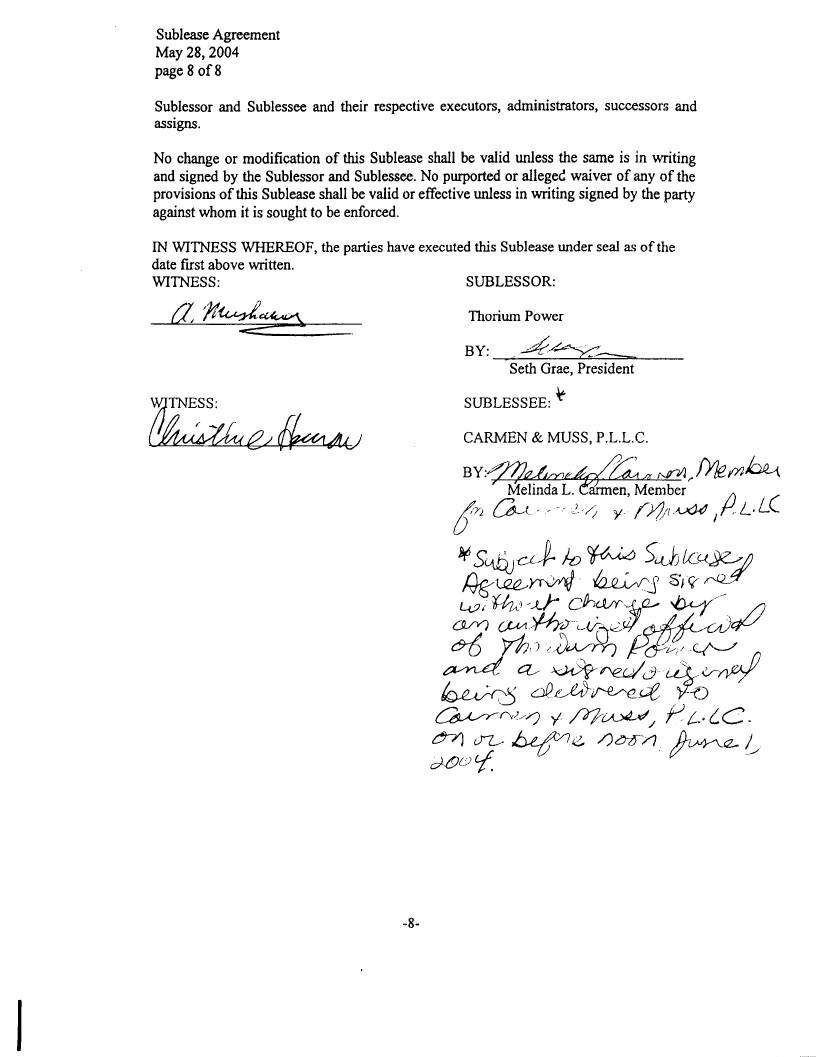 2004, by and between Thorium Power, (hereinafter the “Sublessor”) and CARMEN