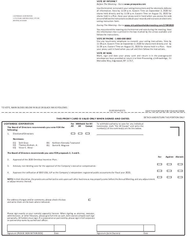 Notice is hereby given that the Annual Meeting of Stockholders (the “annual meeting”) of Lightbridge Corporation, a Nevada corporation (the “Company”), will be held on Thursday, September 3, 2020 at 11 a.m., Eastern Time, for the following purposes: